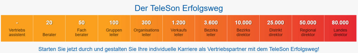 MitjedemeinzelneneingereichtenAuftragbeiderTeleSonarbeitenSiesichvomVertriebsassistentenüber dieeinzelnenKarrierestufendesErfolgswegesbishinzurabsolutenSpitze:WerdenSieLandesdirektorund nehmen Sie eine herausragende und einzigartige Stellung in der TeleSon-Familie ein!