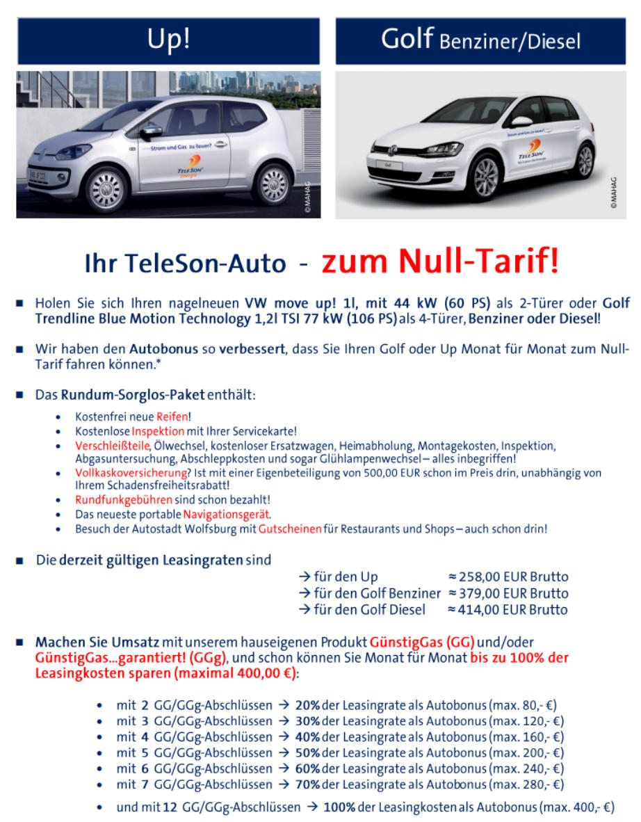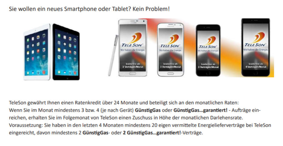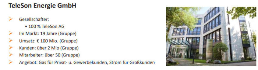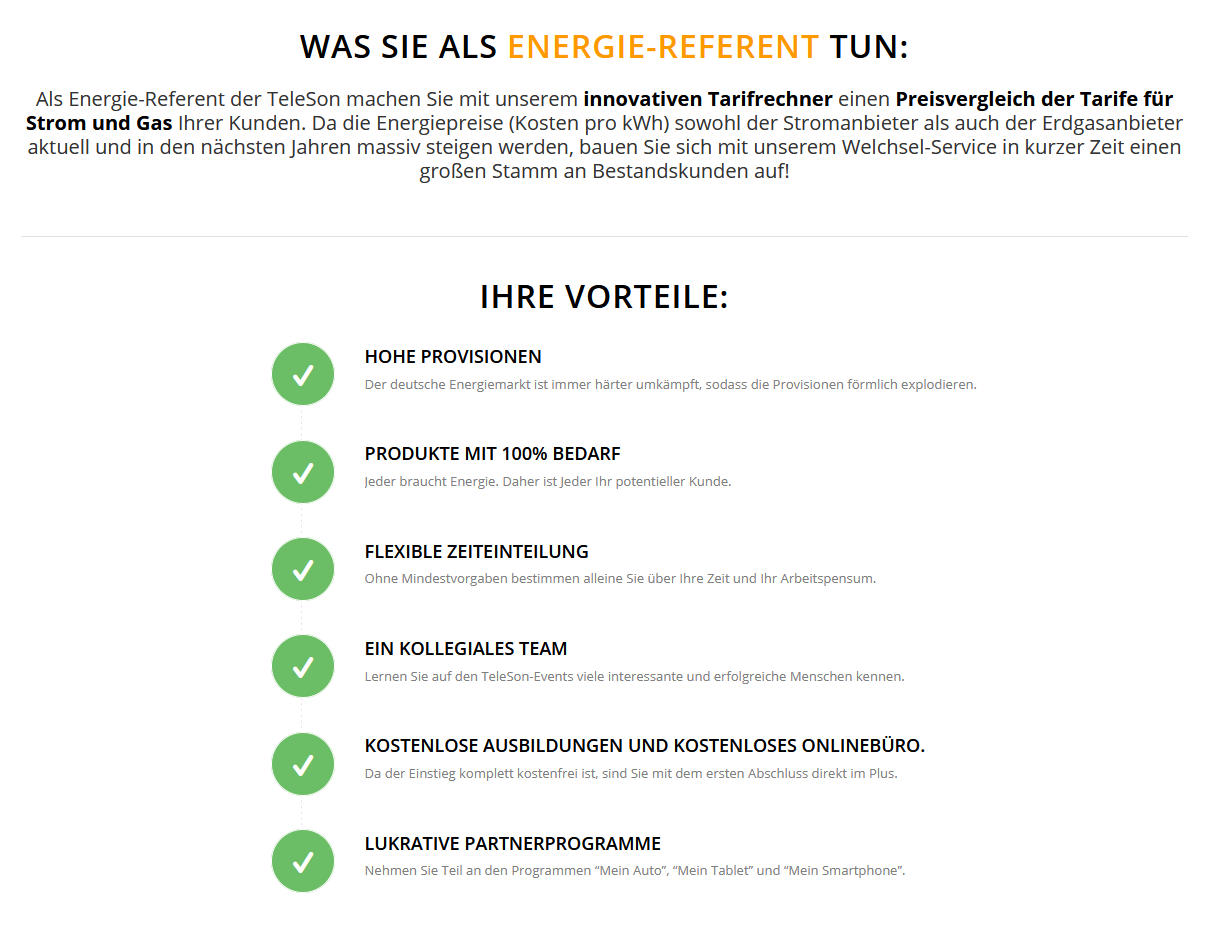 TeleSonistMarktführerinDeutschlandbeiderVermittlungvonStrom-undGasverträgenimDirektvertrieb. MitunsererHilfesparenschon2MillionenVerbraucherMonatfürMonatGeld,dasieihrenStrom-oder Gasanbietergewechselthaben.AufunserebundesweiteVertriebsstärkesetzengroßeEnergielieferanten, alteingesesseneStadtwerkeundNewcomeraufdemdeutschenEnergiemarkt.Daherkönnenunsere VertriebspartnerbeiStrom,GasundWärmeauseinembreitenTarifspektrumpassgenaudenrichtigenTarif wählen und bei Privat- und Geschäftskunden für deutliche Ersparnisse sorgen.