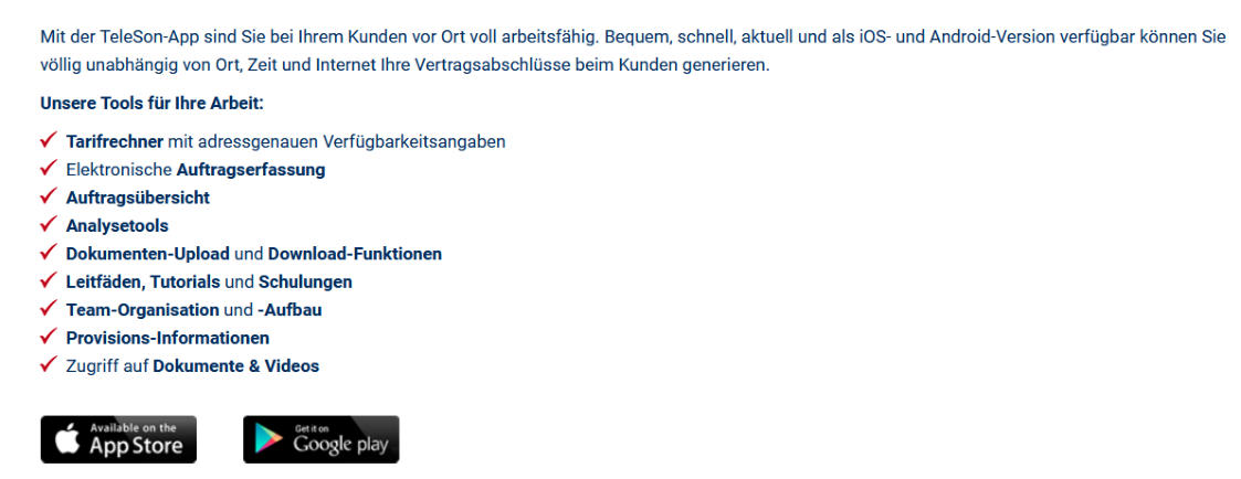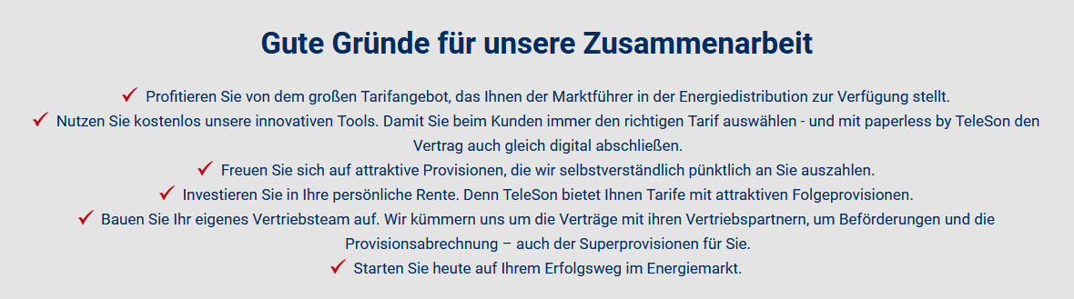 - eigene Homepage- eigenes BackOffice- Teleson APP- Paperless- Schulungen- Webinare- SmartPhone Bonus- Auto Bonus- Teamaufbau- Differenzprovisionen