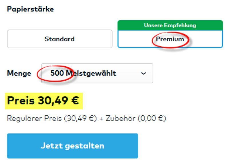 A | Wie und wo bestelle ich meine Visitenkarten?Bei VISTAPRINT - BUSINESSKARTEN - RELIEFLACKhttps://www.vistaprint.de/visitenkarten/praegedruck?xnav=Business+Cards%3ACategory+Page_Category+Page_undefined_primary-left-navigation_16_GPTB | Wo bekomme ich die Vorlagen her? Diese bekommen Sie von uns. C | Welche Stückzahl bestelle ich? 500 Visitenkarten D | Welche Papierstärke gebe ich an? Premium-Mattpapier (350 g/m²): Das ist ein glattes und strapazierfähiges Papier mit Seidenbeschichtung und intensiven Farben. E | Welche Teile sollen mit RELIEFLACK behandelt werden? Bitte schreiben Sie in das entsprechende Feld folgendes rein: Steckdose, rote Zeile, Öko-Strom,Shell, YelloF | Kommt auf die Rückseite auch RELIEFLACK ? Ja. Alarmanlage und wenn vorhanden FotoG | Was wähle ich wenn ich nach der VORLAGE gefragt werde?Fertiges DESIGN verwenden und dann unsere Vorlagen hochladen.H | Was kosten die Visitenkarten? 500 Visitenkarten | Premium Papier | Relieflack = 30-40 EUS brutto